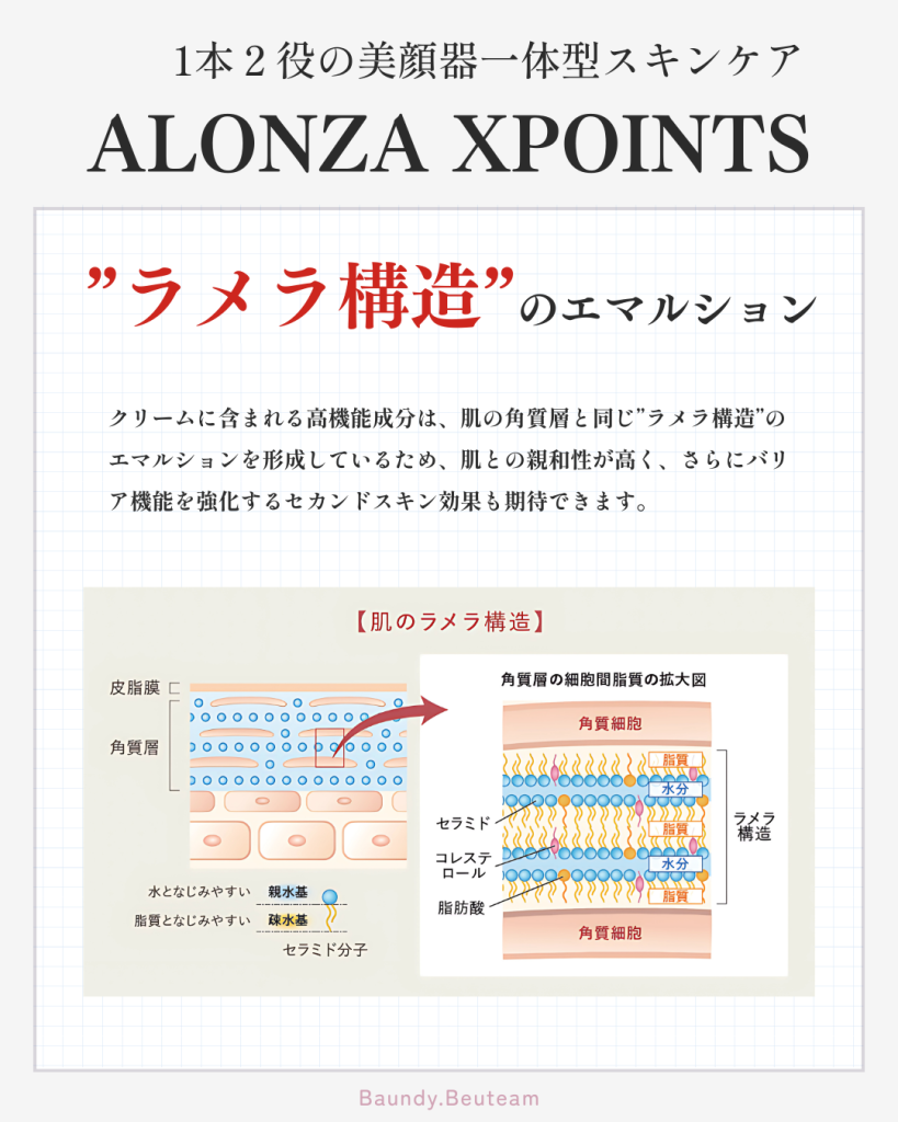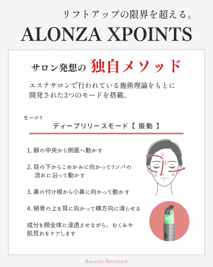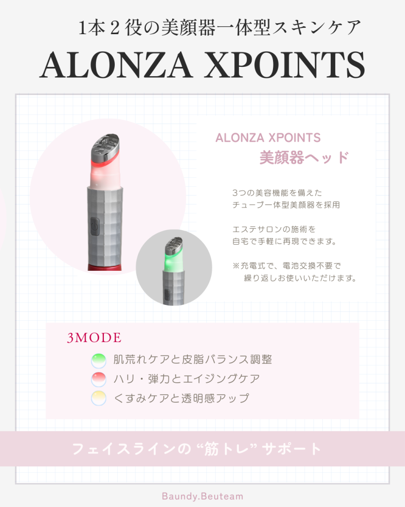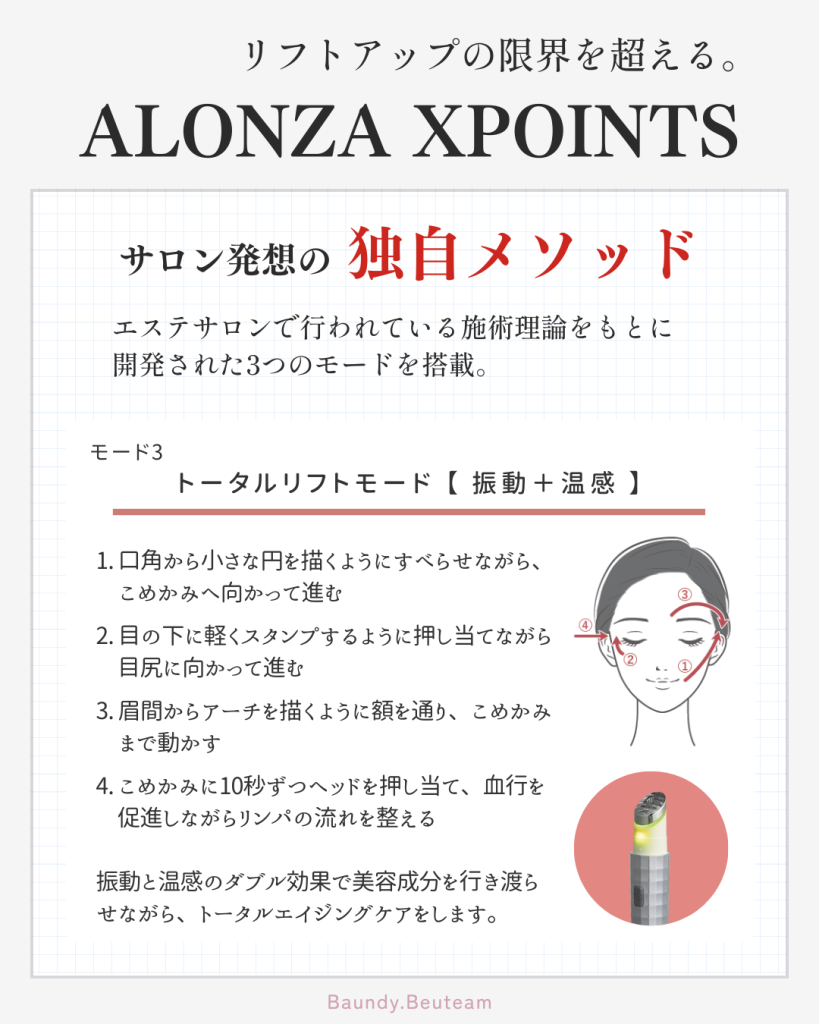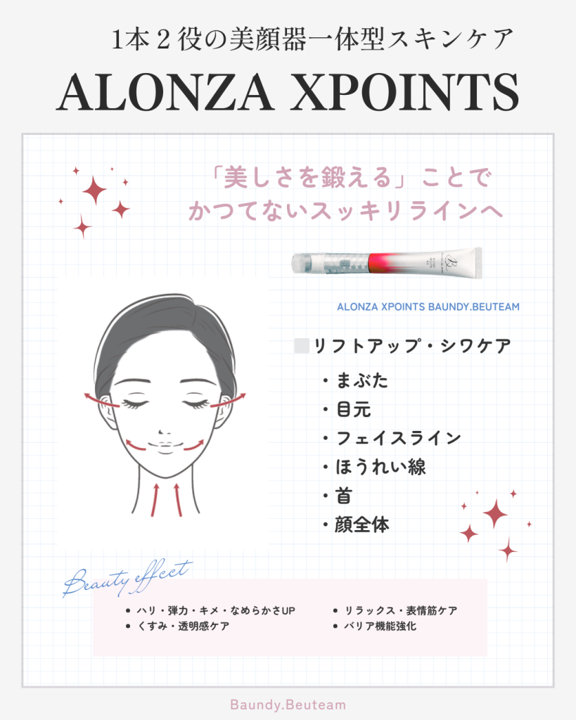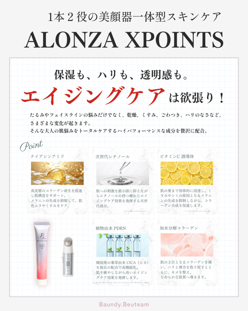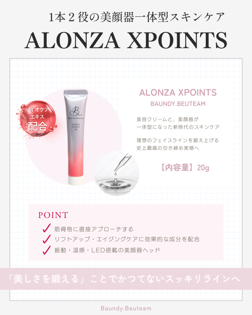たるみ、ほうれい線、弾力低下…年齢肌の悩みに応えるサロン発想の本格ホームケア。肌老化の根本原因である筋骨格と細胞エネルギーに着目し、贅沢成分の美容クリームと3機能美顔器、独自メソッドの融合で「美しさを鍛える」新発想でかつてない*スッキリラインへ。*ALONZAシリーズ内