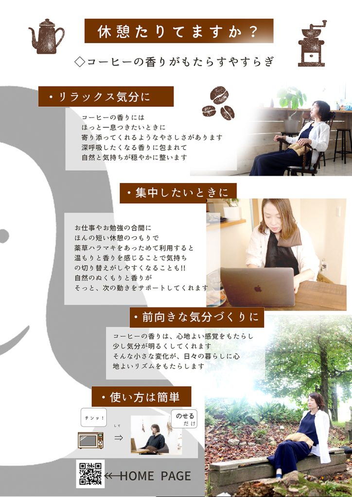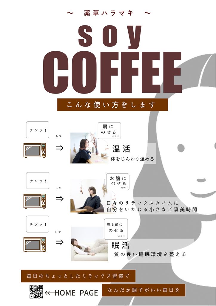 お腹を温めると、人生は快適になる|薬草ハラマキ soy COFFEE 商品名:薬草ハラマキ soy COFFEE薬草ハラマキは、いろんな所にのせてリラックス時間をつくる事ができます※薬草ハラマキは、ハーブと玄米を混ぜあわせて蒸気熱で温める商品です。※サロン様価格の設定ございます。 詳細は担当営業まで。
